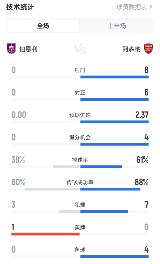 伯恩利0-2阿森纳半场数据:射门0-8,射正0-6,控球率39%-61%