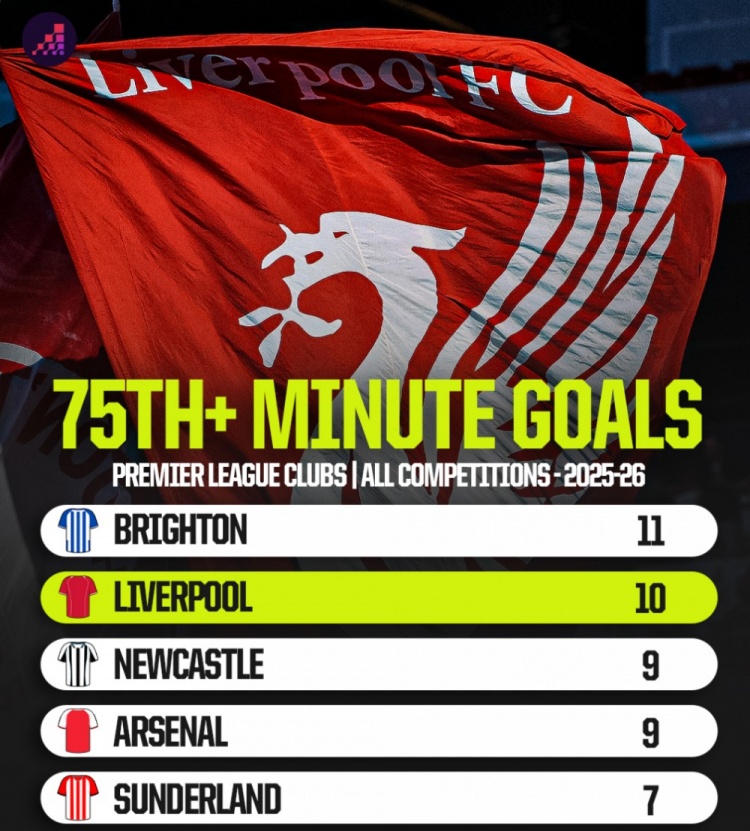 10月31日讯 数据机构OPTA统计了英超球队本赛季各项赛事在75分钟后的进球情况,布莱顿力压利物浦居首。